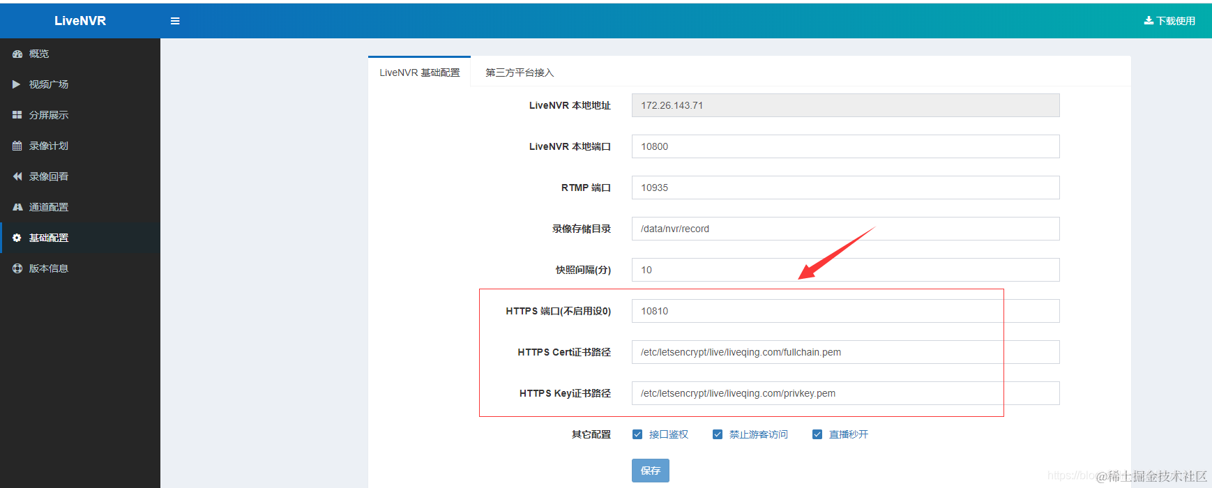LiveNVR监控摄像头web浏览器无插件直播中如何开启HTTPS penggy吴 2021-04-07 153 阅读1分钟 RTSP/Onvif流媒体服务搭建 搭建入口,解压启动即用: www.liveqing.com/docs/downlo… 配置HTTPS 准备工作 获取https证书,如果是从阿里云等下载证书,选择nginx 基础配置页面配置 配置成功后访问如: https://ip:端口 nvr.liveqing.com:10810