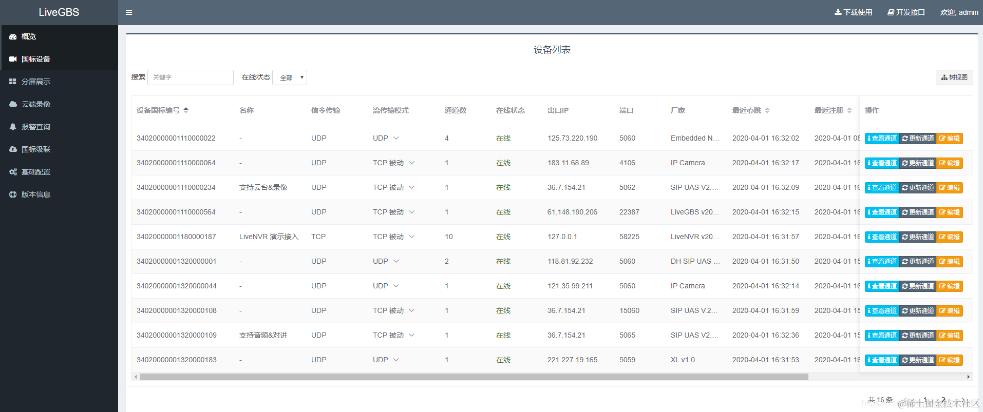 设备或是平台如果支持GB28181的平台接入,就可以在自身的配置管理页面里,配置平台接入。直接通过GB28181接入,LiveGBS国标流媒体服务平台。通过GB28181,我们可以在服务端监控管理各个接入的设备。可以在服务端直接观看直播流。