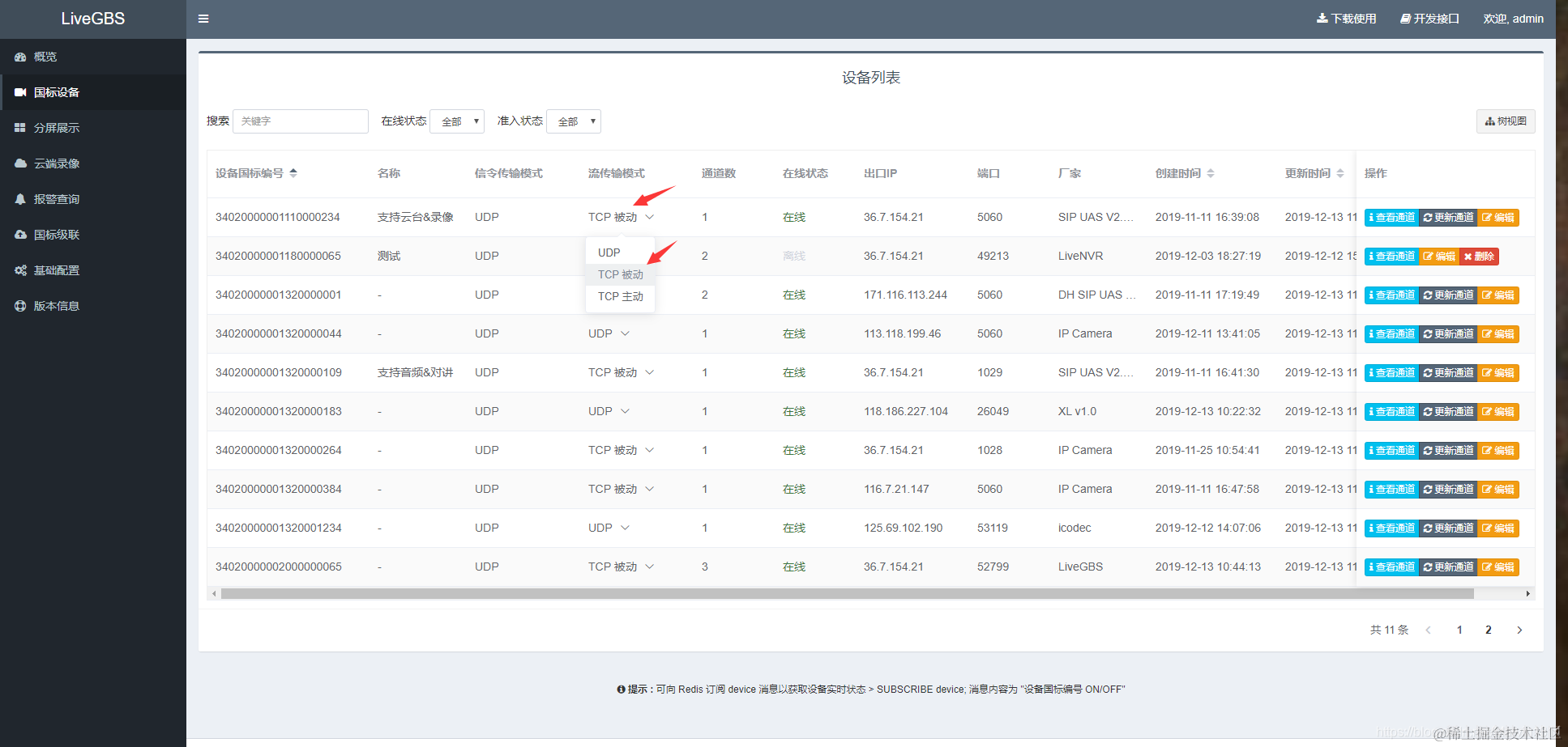 还可以将流传输模式改为 TCP 被动 来改善播放效果: LiveGBS 界面, 右上角登录后, 进入国标设备列表, 在列表视图找到 流传输模式 列, 下拉调整.