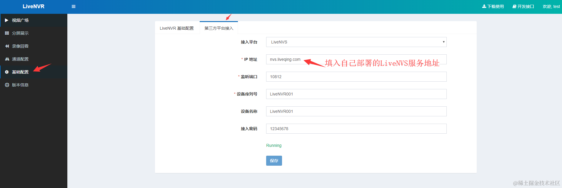 下面是 LiveNVR 第三方平台接入配置的截图, 供参考