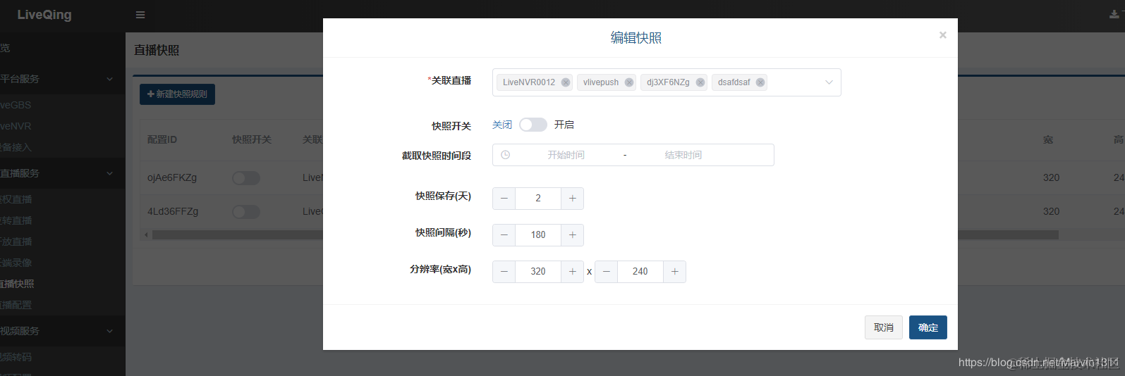 如何利用LiveQing流媒体服务搭建视频快照直播监控-配置定时快照、实时检索 penggy吴 2021-04-07 86 阅读1分钟 直播点播流媒体服务 具体说明参见:www.liveqing.com/docs/manual… 创建直播快照 快照检索