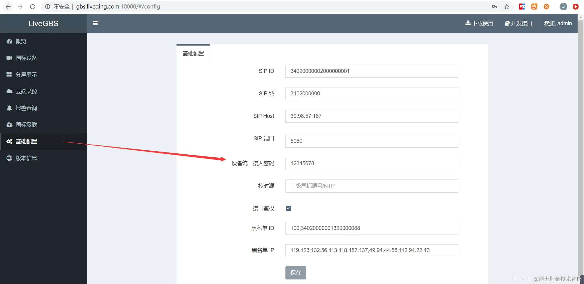 LiveGBS国标流媒体服务基础配置页面默认接入密码是:12345678 。如果不需要接入认证的话可以把接入密码填空。