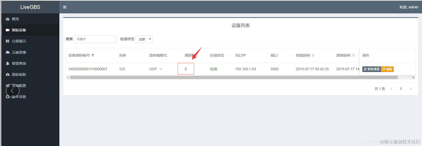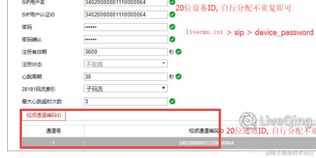 海康、大华等设备GB28181接入LiveGBS国标流媒体服务后通道数为0的问题处理 penggy吴 2021-04-07 289 阅读1分钟 问题:NVR接入国标服务后通道显示为0 尝试操作一:更新通道 尝试操作二:NVR设备中配置【视频通道编码ID】 视频通道编码ID格式 列如按照:34020000001320000001 , 只改最后两位 具体通道号规则参考G28181协议标准:统一编码规则