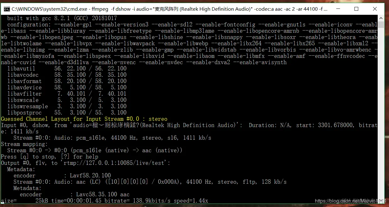 ffmpeg -f dshow -i audio="麦克风阵列 (Realtek High Definition Audio)" -codec:a aac -ac 2 -ar 44100 -f flv "rtmp://127.0.0.1:10085/live/test"