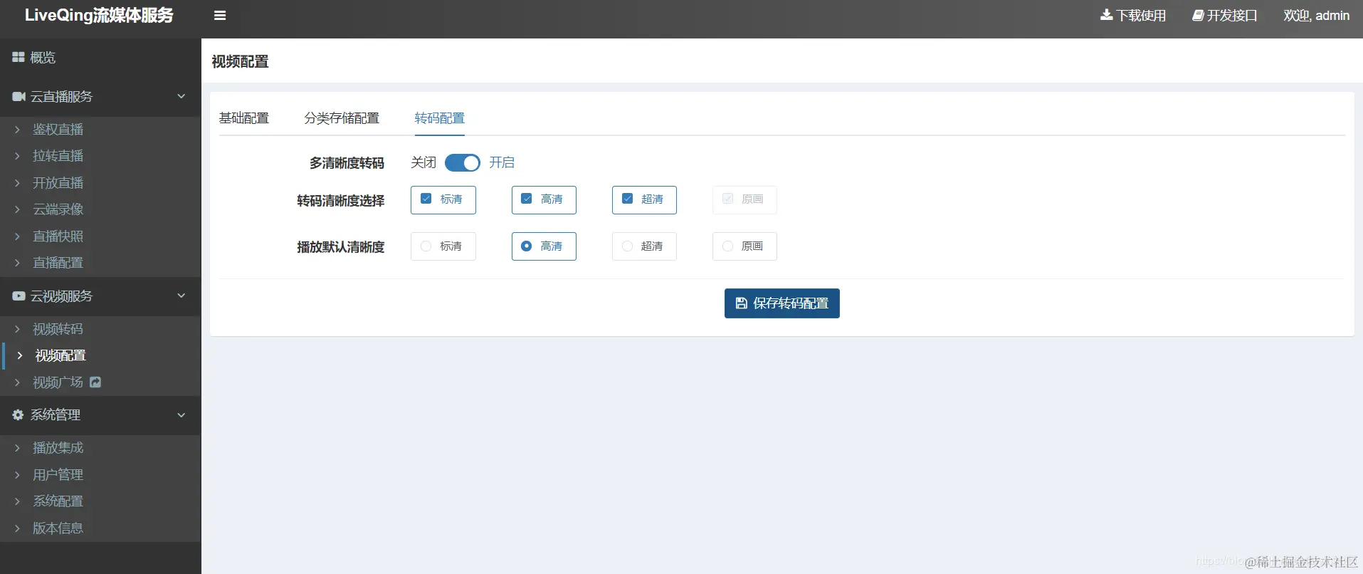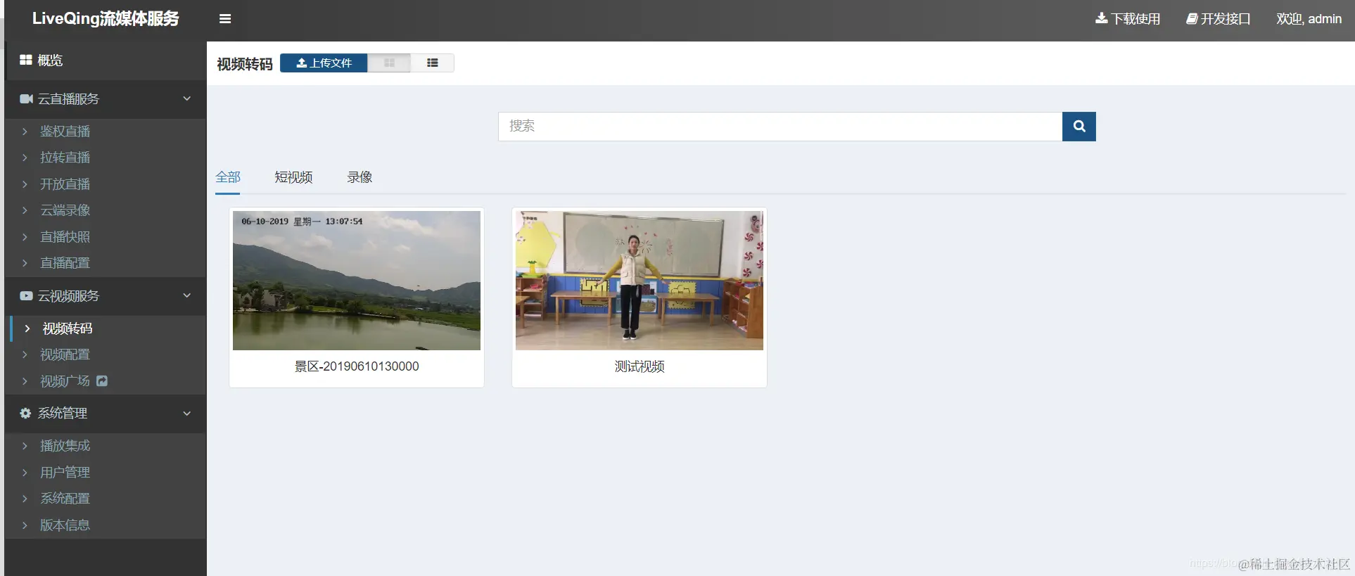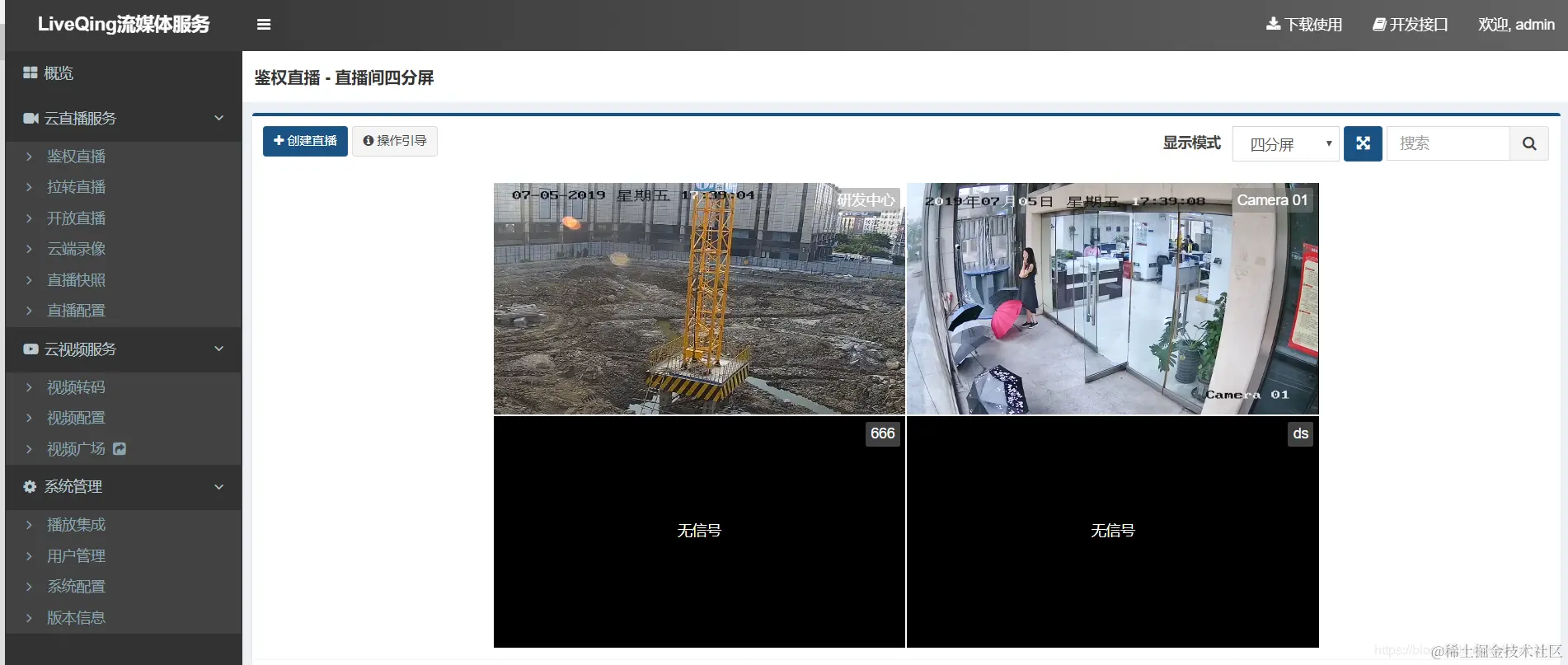 LiveQing云平台直播点播流媒体服务: 一站式视频点播和直播解决方案,提供多清晰度转码,高性能RTMP流媒体服务,多种格式流分发服务,播放集成,将设备的推流进行无插件的互联网直播,提供了多层级的安全模式,支持转推组网,可视化的WEB管理及详细的二次开发文档