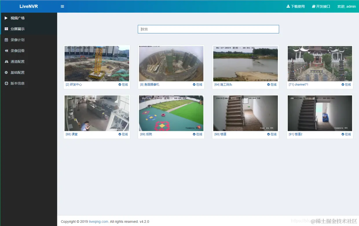 LiveNVR Onvif/RTSP流媒体服务,支持RTSP稳定拉流接入,支持Onvif协议接入,支持RTMP/HLS/HTTP-FLV分发,将传统安防监控设备互联化,无插件直播等。
