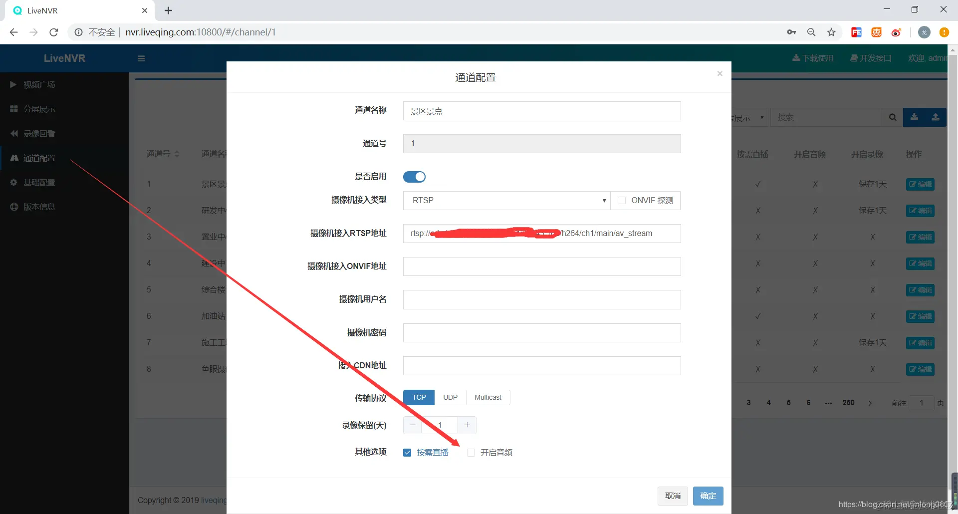 对于有音频需求的可以通过勾选“开启音频”来进行设置:默认没有音频,有需要,勾选上并保存配置即可;