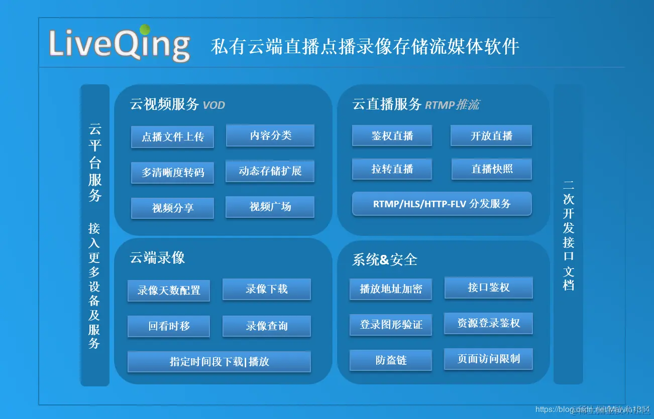 LiveQing云端直播点播流媒体软件: 提供设备接入; RTMP推流服务、RTMP分发、HLS分发、HTTP-FLV分发; 云端录像、云端录像检索、云端录像点播、云端录像下载; RTMP转推、推流鉴权验证、推流信息统计、播放信息统计; 直播分享、开放直播、拉转直播; 视频上传、视频转码、视频分享、视频下载; 后台管理、二次开发接口、防盗链、播放地址加密、播放器集成等。