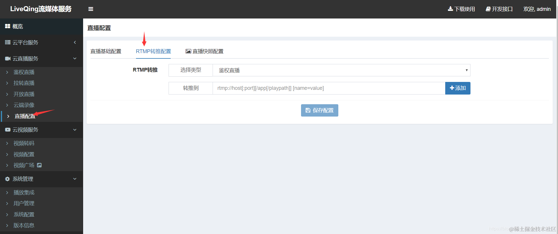 - 比如当前流媒体服务 有个ID为 test 的鉴权直播,则当前流媒体服务会将该 test 的鉴权直播转推到 rtmp://desthost:10085/testapp/testpath 这个目标地址上;
