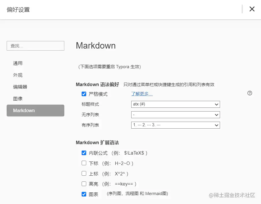 Typora中markdown的文件无法识别行内公式(内联公式) 清料家232 2021-04-07 766 阅读1分钟 行内公式属于LaTeX扩展语法,而不属于Markdown的通用标准。为了使Typora予以解析,需要在Typora的“文件”-“偏好设置”中,勾选“内联公式”一项,如下图所示。 注意:由于这个语法并非通用标准而是扩展,所以可能在很多其他的Markdown编辑器中无法解析。 在勾选完成后,需重启Typora,方可使用。
