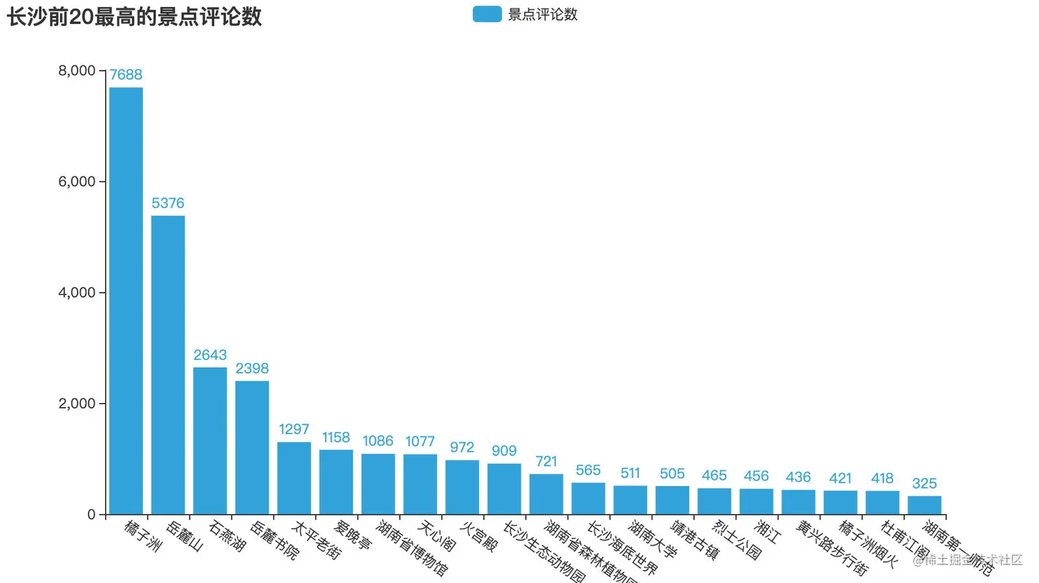 通过排名我们发现:橘子洲(烟火、大桥、天心阁)、岳麓山(书院)、黄兴路步行街、马王堆汉墓遗址、湖南省博物馆,整体排名很靠前,深受游客们欢迎,具体看看排名前20的景点: