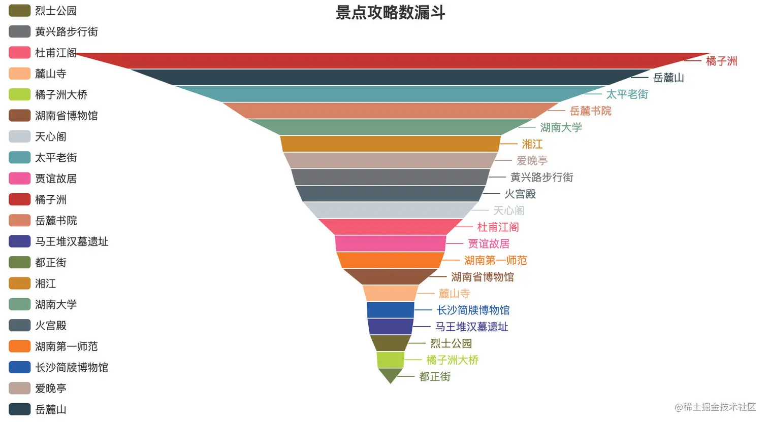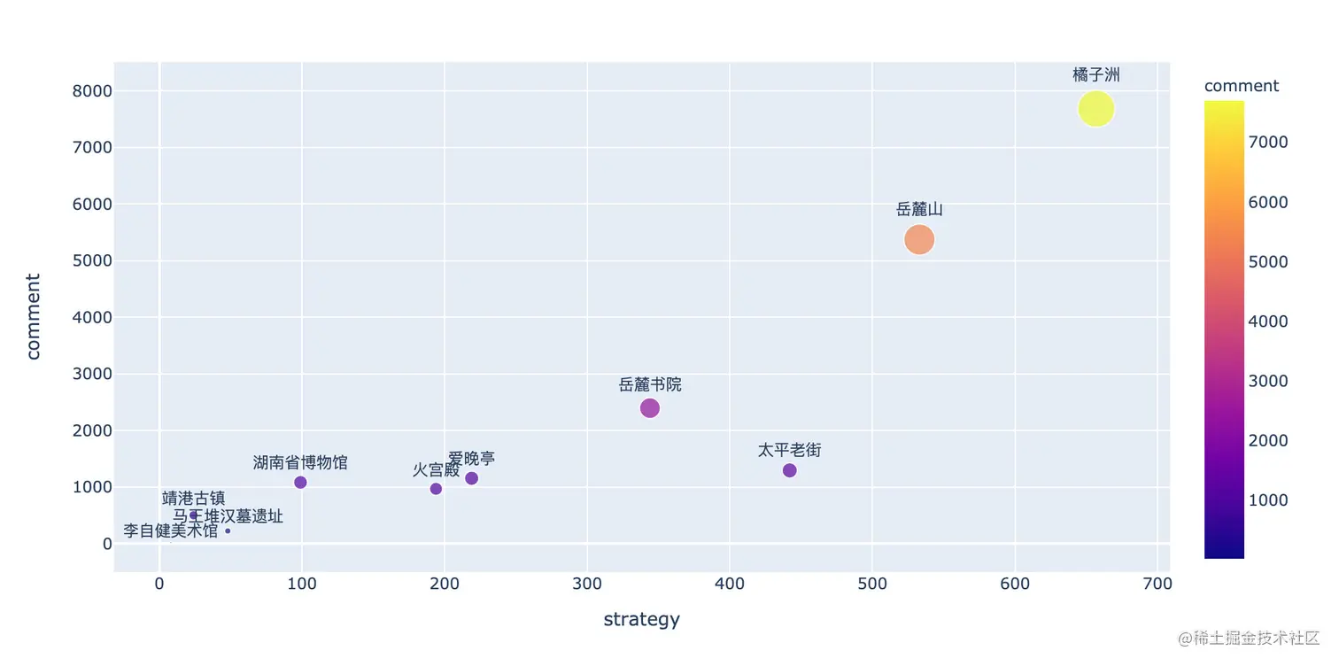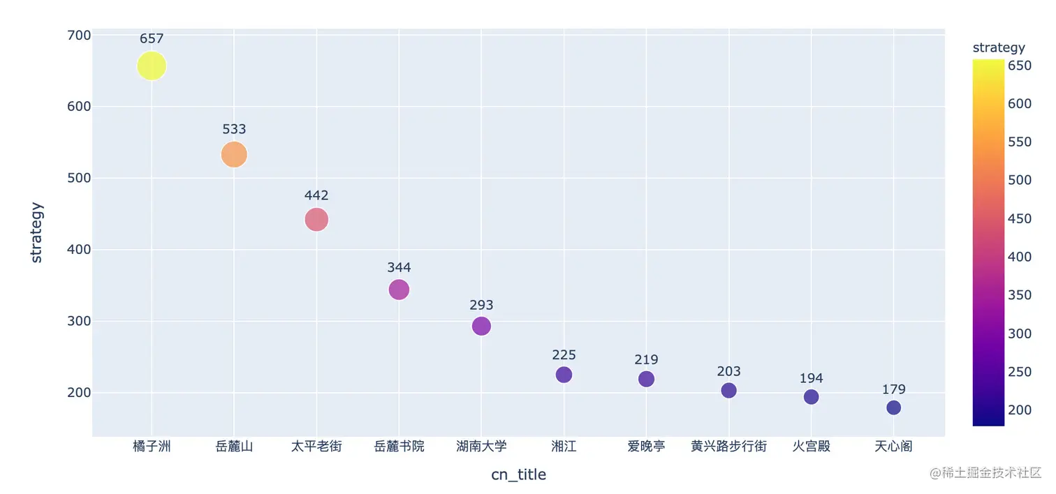 从长沙景点数据分析中看出来,不管是整体排名、游客提供的攻略数、评论数,橘子洲都是排名第一的,可以在橘子洲大桥看烟火🎆