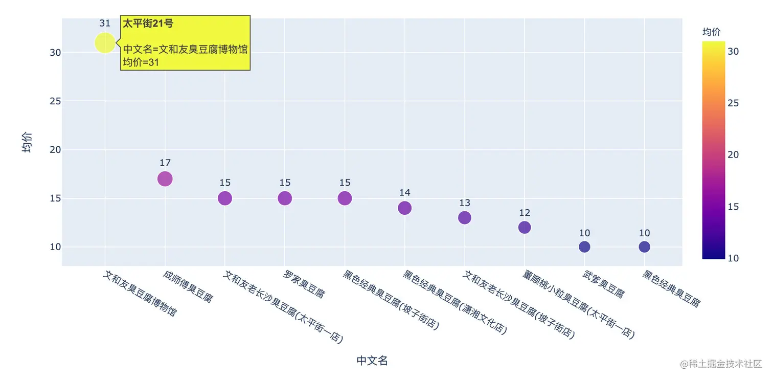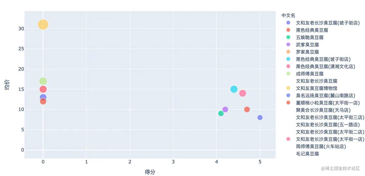 px.scatter(choudoufou,x="得分",y="均价",color="中文名",size="均价") # 只筛选均价大于0