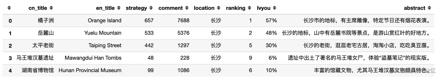 最终数据有1152条,数据中绝大部分是长沙的景点数据,也有少量周边城市,比如:宁乡、浏阳等的数据,整体的数据前5行如下: