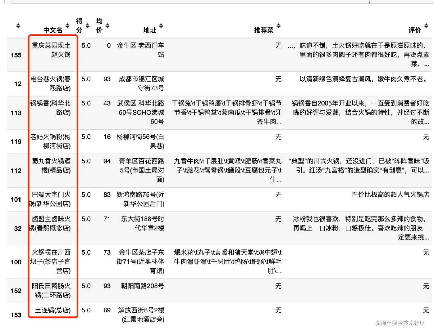 到了成都一定得吃火锅吧???数据显示我们获取到的有213家火锅店,相信肯定是不止这个数。