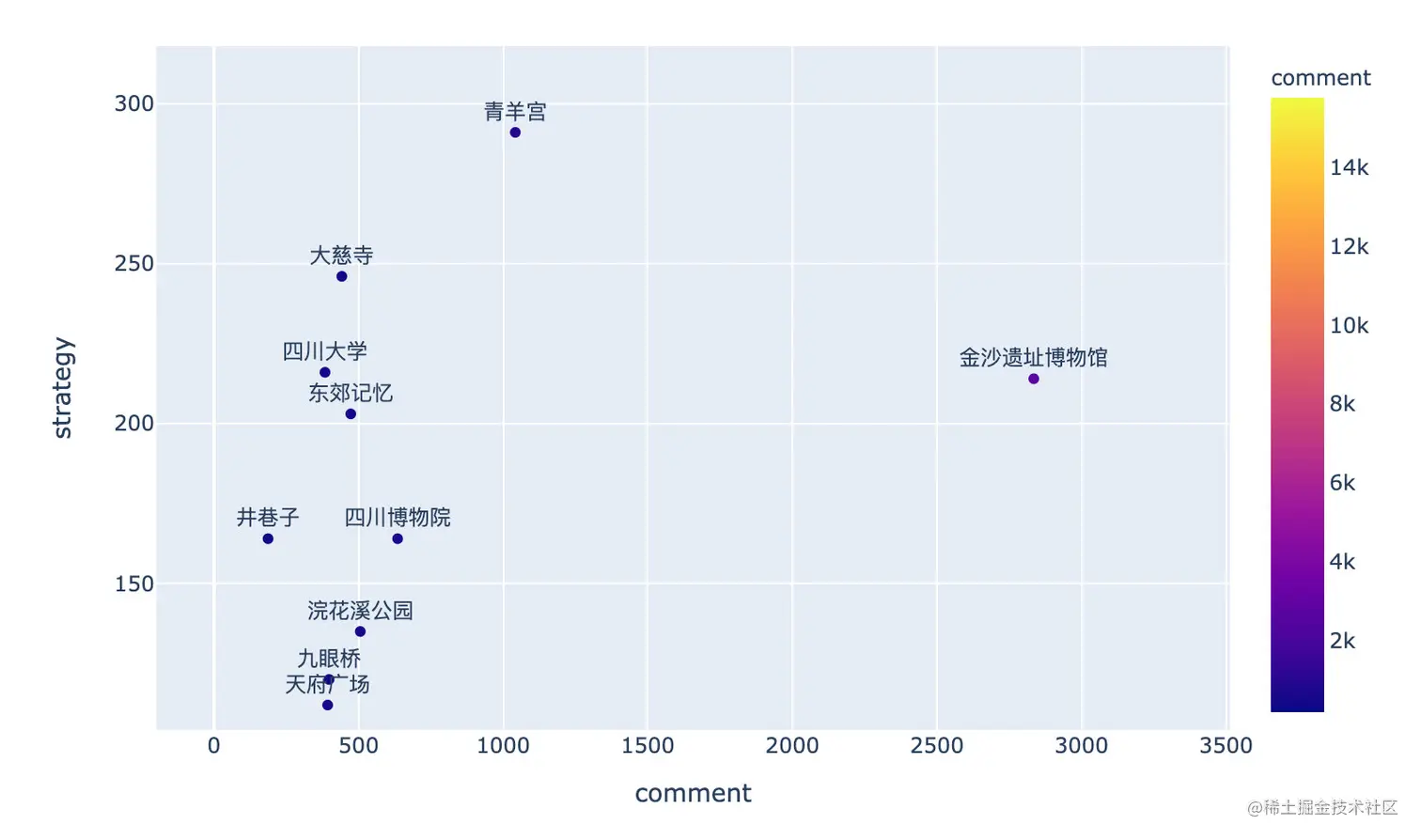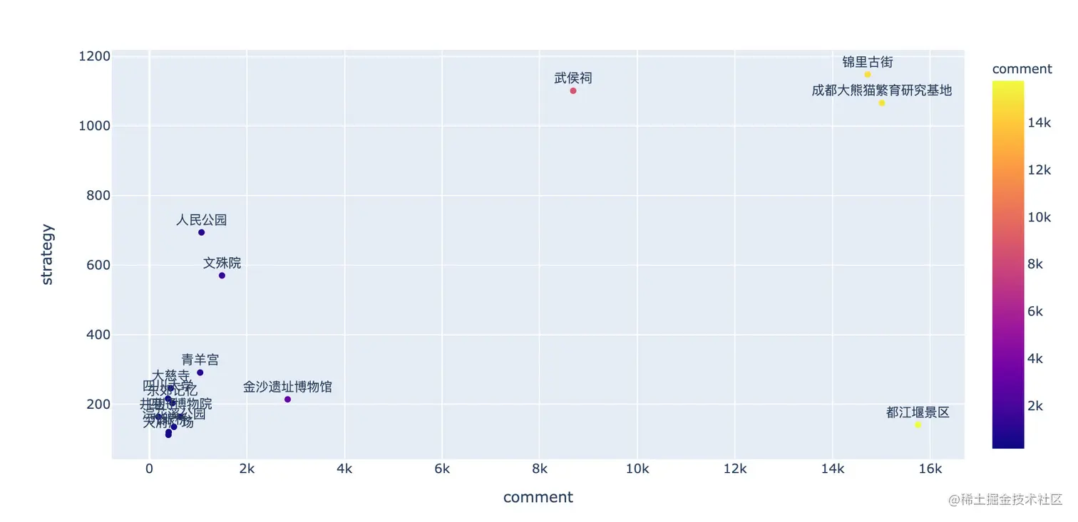 通过景点的散点图分布,我们发现了成都的几个热门景点: