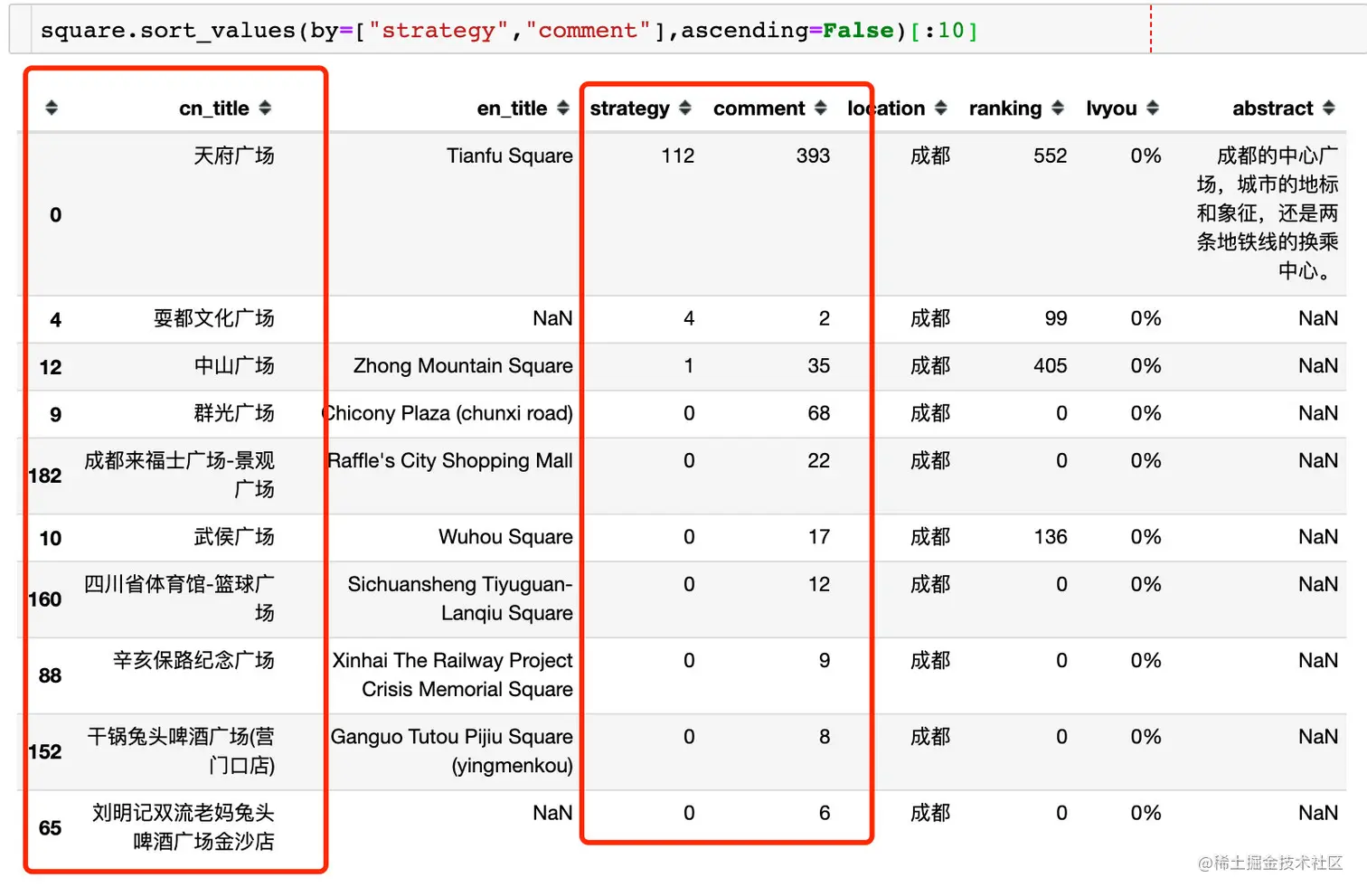 根据广场的攻略数strategy和评论数comment进行降序排列,我们发现几个广场最为突出: