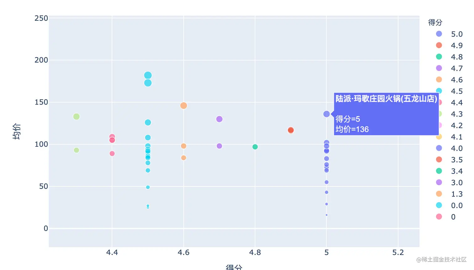 px.scatter(guo,x="得分",y="均价",color="得分",hover_name="中文名",size="均价")