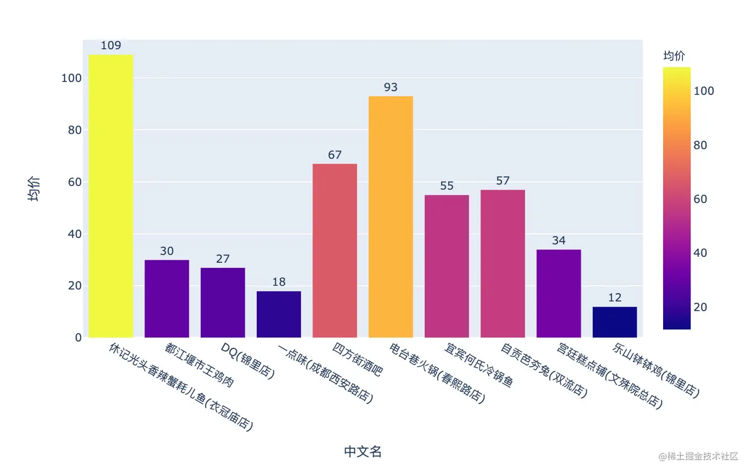 fig = px.bar(score,x="中文名",y="均价",color="均价",text="均价")