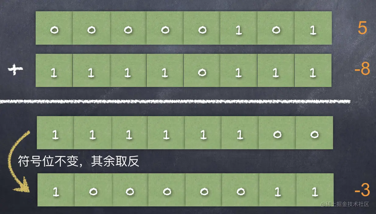 再来计算一下减法:5 - 8,对于 CPU 来说,只会计算 5 + 8, 但是不会计算 5 - 8。