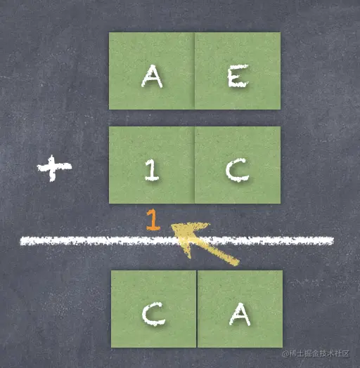第 0 位:E + C,结果为 26,但是十六进制中没有 26 这个数字,因此需要向左侧的高位进 1,于是第 0 位就剩下 26 - 16 = A。
