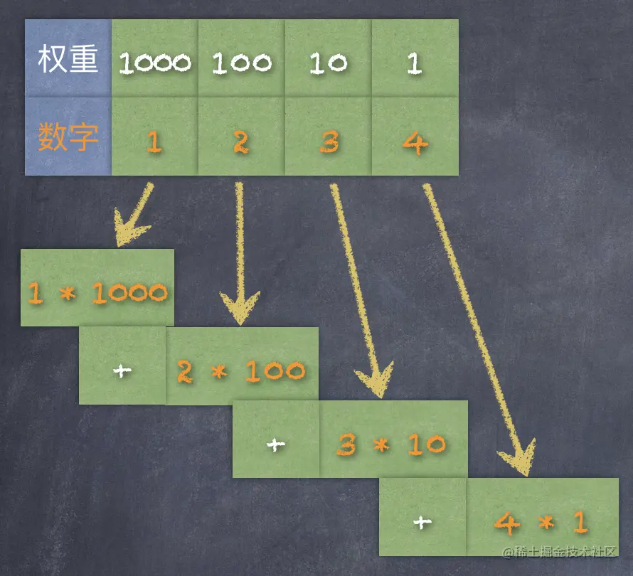 十进制的数,可以使用后缀字母 D 来表示,也可以省略。例如:十进制的 1234 这个数字,个位上的数是 4, 十位上的数是 3, 百位上的数是 2,千位上的数是 1(一般是从最右侧的个位说起),每一个数位上的数比它右侧大十倍。 如下图: