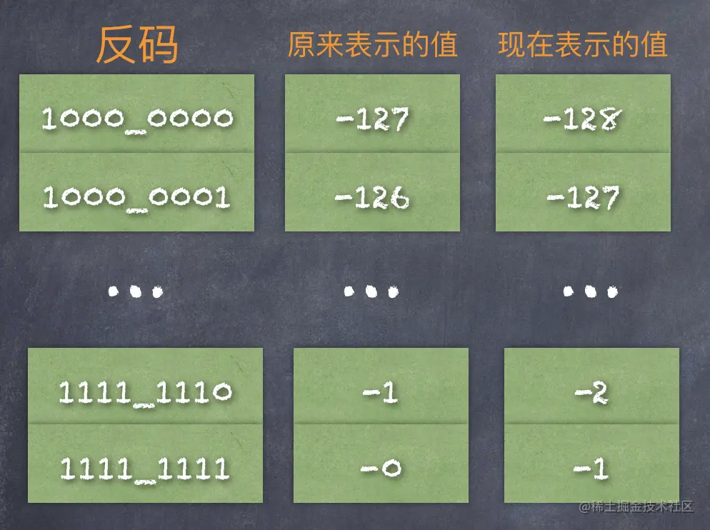 既然每一个二进制表示的值发生了变化,那么继续称之为反码就不准确了,此时给它们一个新的称呼:补码,也就是说:上图就变成了这样: