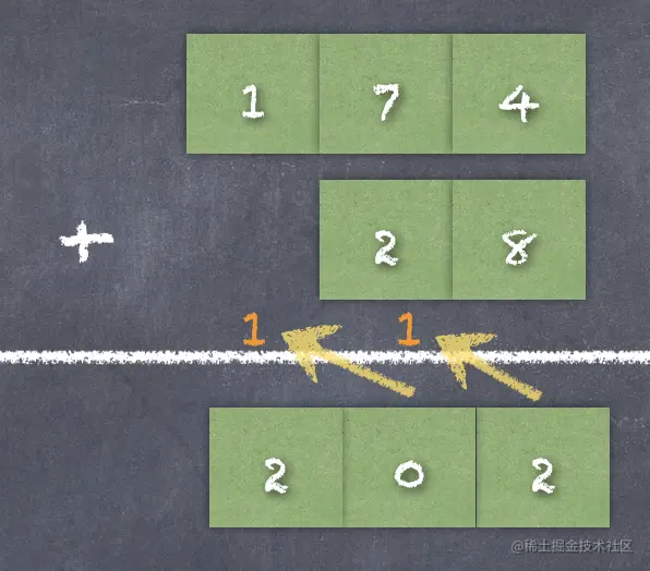 十位上:7 + 2,再加上进位 1,结果是 10,但是十进制中没有 10 这个数字,因此向左侧的高位进1,十位变成:10 - 10 = 0。