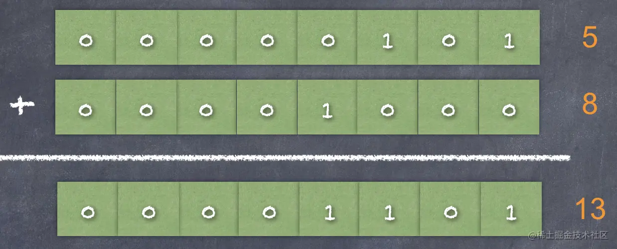 我们都知道,CPU 中有加法器,好像从来没有听说过“减法器”。例如计算 5 + 8,转换成二进制来计算: