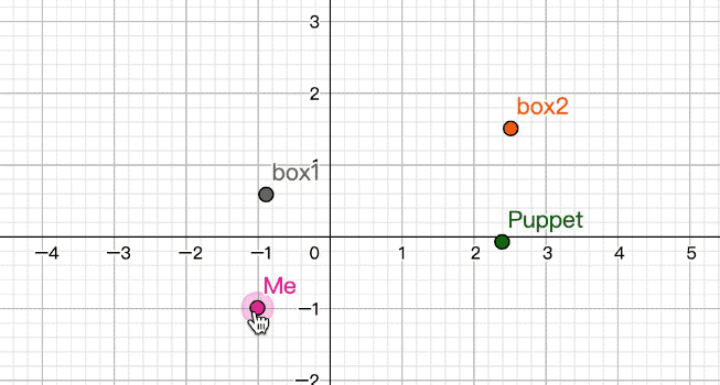 这就是一个简单的示意,我相对于 box1 的运动,会 1:1 反映在 Puppet 和 box2 上。但这个图像是二维的,而且只是控制了点的二维平移,没有缩放、旋转和三维的平移。