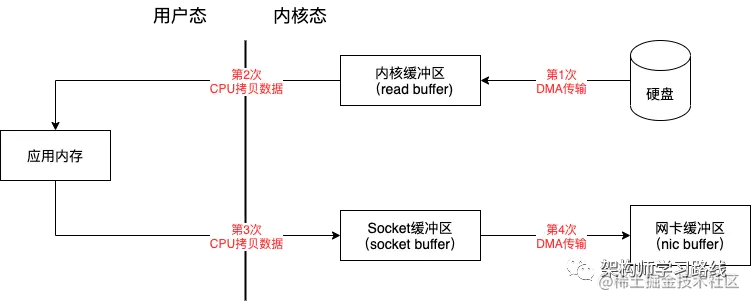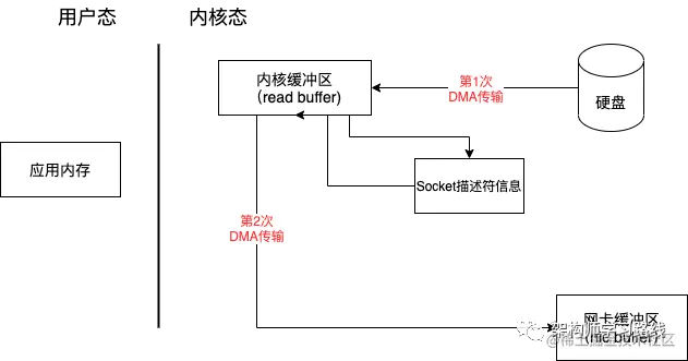 第一次,是通过 DMA,从硬盘直接读到操作系统内核的读缓冲区里面。第二次,则是根据 Socket 的描述符信息,直接从读缓冲区里面,写入到网卡的缓冲区里面。