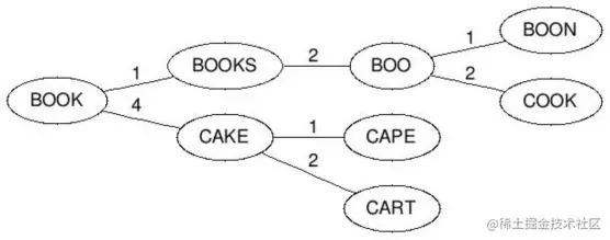 (3)查询相似词如下:计算单词与根节点的编辑距离 d,然后递归查找每个子节点标号为 d-n 到 d+n(包含)的边。假如被检查的节点与搜索单词的距离 d 小于 n,则返回该节点并继续查询。比如输入 cape 且最大容忍距离为 1,则先计算和根的编辑距离 d(“book”, “cape”)=4,然后接着找和根节点之间编辑距离为 3 到5 的,这个就找到了 cake 这个节点,计算 d(“cake”, “cape”)=1,满足条件所以返回 cake,然后再找和 cake 节点编辑距离是 0 到 2 的,分别找到 cape 和cart 节点,这样就得到 cape 这个满足条件的结果。