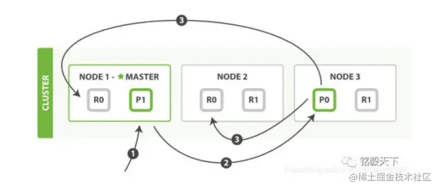 第一步:客户写集群某节点写入数据,发送请求。(如果没有指定路由/协调节点,请求的节点扮演路由节点的角色。) 第二步:节点 1 接受到请求后,使用文档_id 来确定文档属于分片 0。请求会被转到另外的节点,假定节点 3。因此分片 0 的主分片分配到节点 3 上。 第三步:节点 3 在主分片上执行写操作,如果成功,则将请求并行转发到节点 1和节点 2 的副本分片上,等待结果返回。所有的副本分片都报告成功,节点 3 将向协调节点(节点 1)报告成功,节点 1 向请求客户端报告写入成功。 如果面试官再问:第二步中的文档获取分片的过程? 回答:借助路由算法获取,路由算法就是根据路由和文档 id 计算目标的分片 id 的过程。 1shard = hash(_routing) % (num_of_primary_shards)