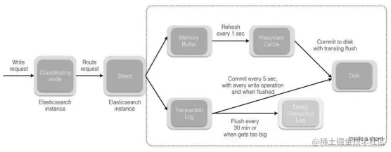 (1)当分片所在的节点接收到来自协调节点的请求后,会将请求写入到 MemoryBuffer,然后定时(默认是每隔 1 秒)写入到 Filesystem Cache,这个从 MomeryBuffer 到 Filesystem Cache 的过程就叫做 refresh;