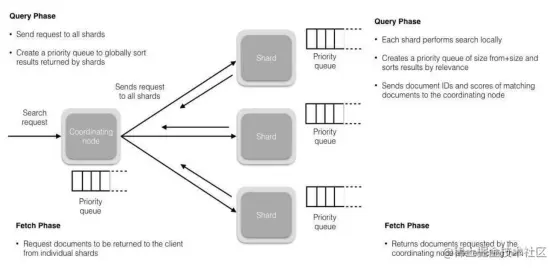 (3)第 2)步骤的结果发送到协调节点,协调节点产生一个全局的排序列表。fetch 阶段的目的:取数据。路由节点获取所有文档,返回给客户端。