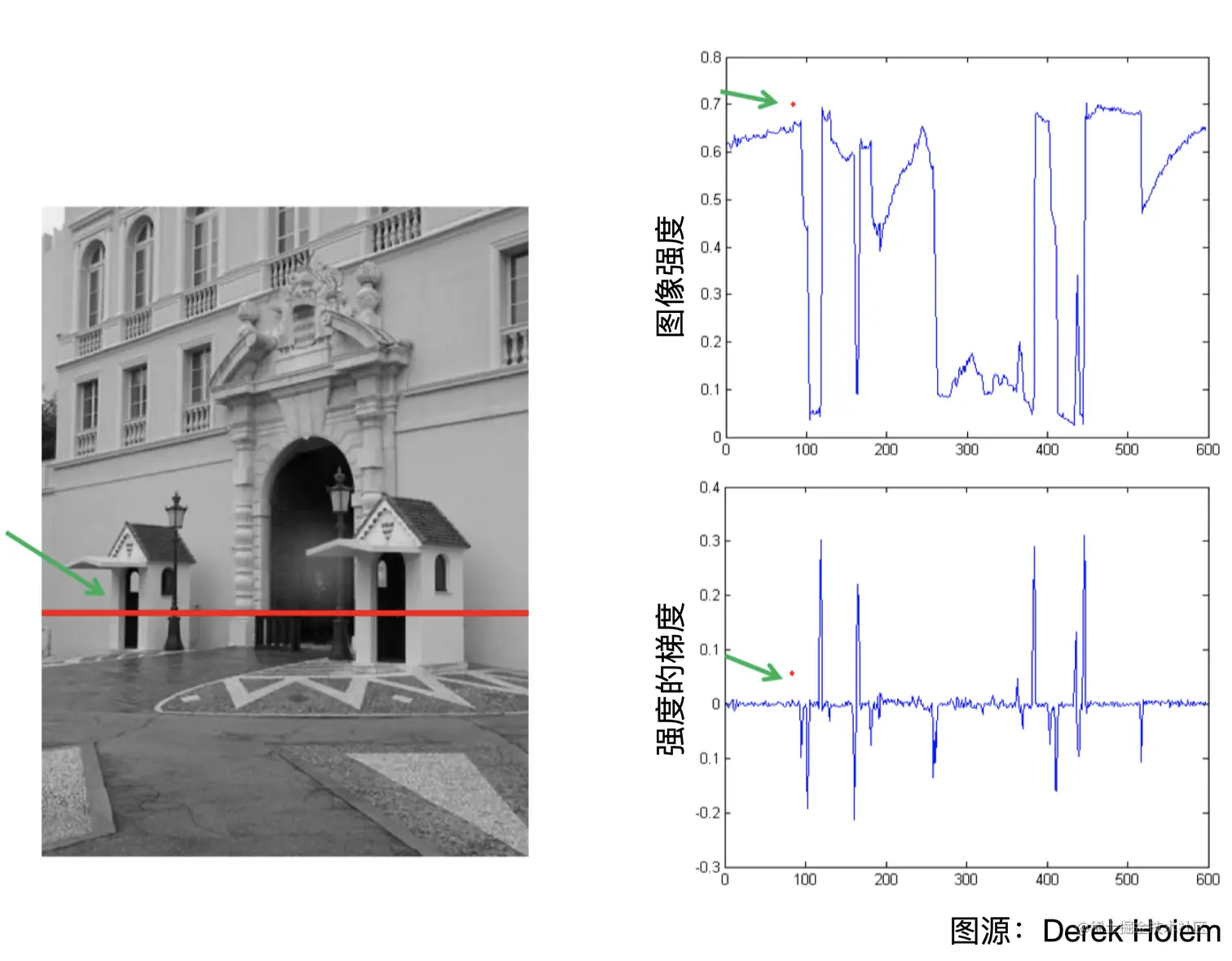 最简单的边缘检测器就是检测图像上强度变化剧烈的地方。 比如对于下面左侧图中红线一行的强度变化如右上图所示,可以明显观察到,有边缘的地方,强度变化十分剧烈。 二如果对强度函数求离散梯度,即可得到右下图,梯度值较大的地方即为强度函数变化剧烈的地方,也就是图像上边缘所在地方。