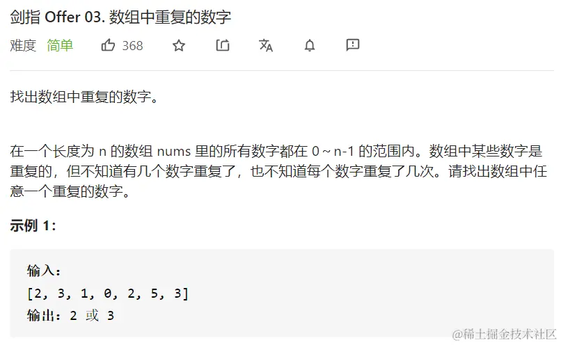 剑指Offer——数组中重复的数字(JS实现) Always_positive 2021-04-08 0 阅读1分钟 题目描述 解题思路 使用Map数据结构键存储元素,值存储出现的次数 只要出现重复,直接返回 实现代码 var findRepeatNumber = function(nums) { const m = new Map(); for (let v of nums) { if (m.has(v)) { return v; } else { m.set(v,1); } } };
