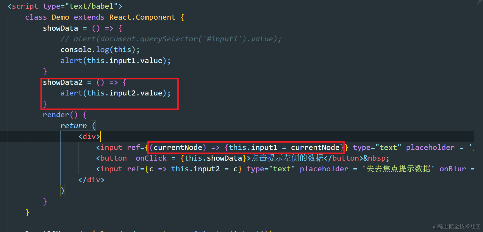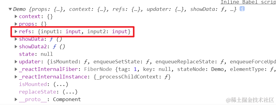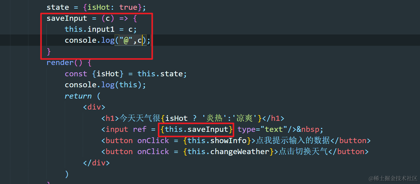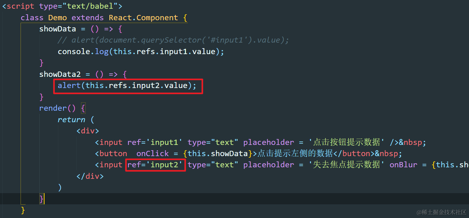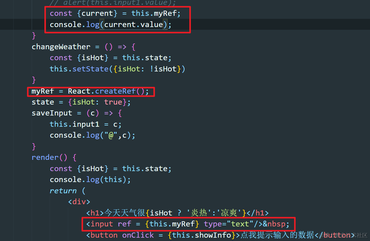 React-13:组件实例的三大核心属性之refs Always_positive 2021-04-08 291 阅读1分钟 refs有什么作用? 可以理解为充当JSX用法标签中的标识符,为了区分和定位JSX标签用的。 回调形式的ref 注意:通过回调形式的ref,标识符是直接添加到类的实例对象上的,而不是refs ref中的回调函数执行的次数 如果ref中的回调函数是内联函数的形式的话,当更新状态时,这个函数会被执行两次,第一次传入null,第二次才回传入当前节点的信息。 JSX语法中如何进行注释? 通过{/* */}的方法进行注释 类绑定中的ref回调只在初始化的时候执行一次 使用React.createRef创建ref 使用这个API创建的ref容器中,只能存放一个标签,新标签会覆盖原有的。 基础用法