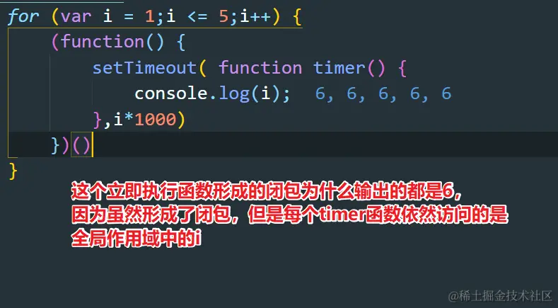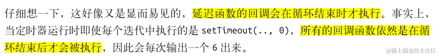 - 在看懂for循环中的闭包问题时,我们首先要知道一点,那就是延迟函数的回调通常是在循环结束的时候才执行,即使setTimeout的第二个参数是0.