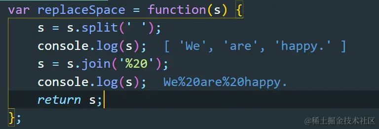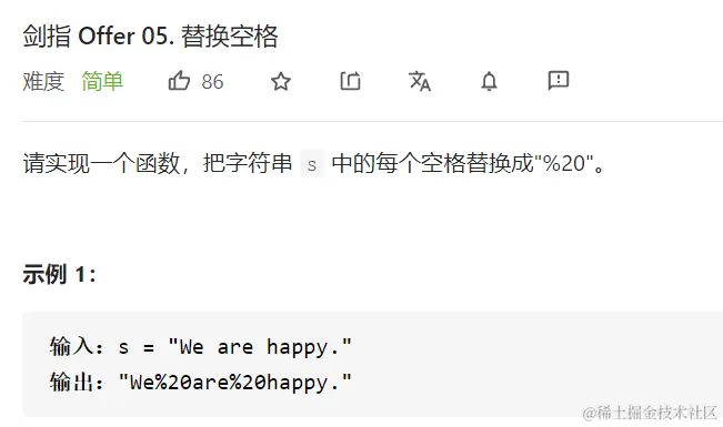 剑指Offer——替换空格(JS实现) Always_positive 2021-04-08 138 阅读1分钟 题目描述 解题思路1:使用js中的replace方法 使用replace方法,配合正则全局匹配 实现代码 var replaceSpace = function(s) { s = s.replace(/ /g,'%20'); return s; }; 解题思路2:使用js中的split+join split(’ ')将字符串根据空格,划分为字符数组 join(’%20’) 将字符数组进行组合成字符串 实现代码