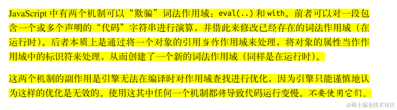 「注解」《你不知道的JavaScript(上卷)》第二章:词法作用域 Always_positive 2021-04-08 61 阅读1分钟 词法阶段 逐级嵌套的作用域举例 查找 欺骗词法 eval()函数 严格模式下的eval函数是无效的 with关键字 基本用法 使用with有时候会污染全局变量 性能 小结