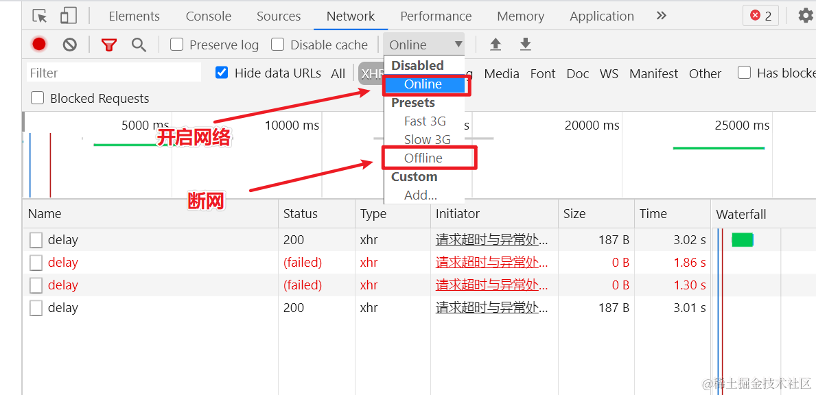 Ajax-12:请求超时与异常处理 Always_positive 2021-04-08 107 阅读1分钟 设置多久之后请求不到即取消请求 超时回调 上面的两个语句要结合使用。 浏览器断网开关 断网提示