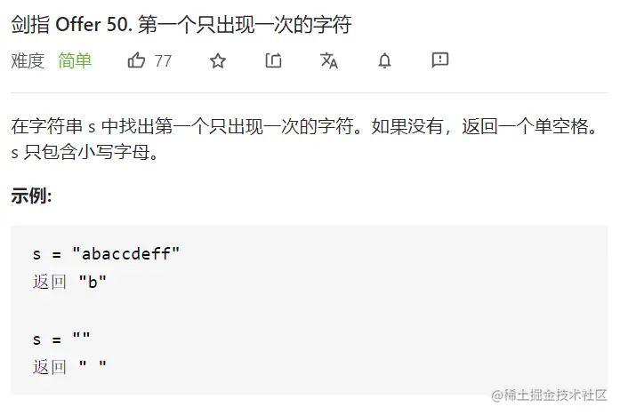 - 将字符列为键,该字符出现的次数列为值,找到第一个值为1的即为返回值