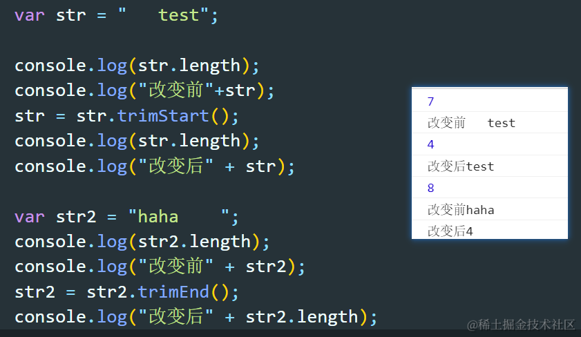 ES6—53:字符串方法拓展 Always_positive 2021-04-08 78 阅读1分钟 trimStart与trimEnd方法 trimStart()方法用于清除字符串左侧空白,trimEnd()方法用于清除字符串右侧空白。