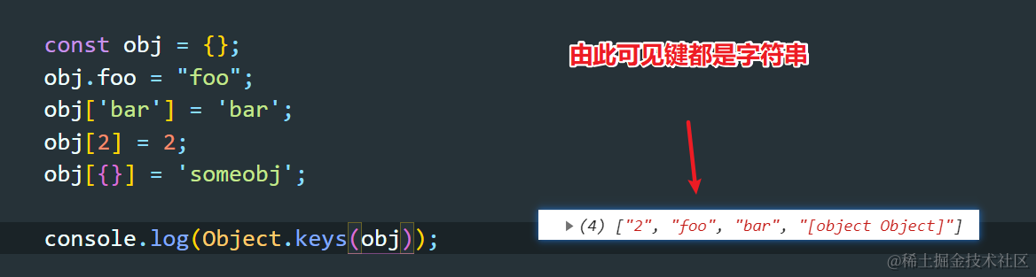 对象在JavaScript中扮演着重要的角色,几乎所有地方可以见到它们的身影。对象通常是键值对的集合,然而这种形式的最大限制是:对象的键只能是字符串,知道Symbol出现这一限制才得到解决。如果我们使用非字符串的值作为对象的键,该值会被强制转换为字符串。下面的程序中可以看到这种强制转换: