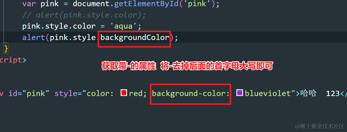 Dom中元素节点的操作方法 Always_positive 2021-04-08 98 阅读1分钟 获取元素节点的名字 var pink = document.getElementById('pink'); pink.tagName(); 获取元素节点的属性 var pink = document.getElementById('pink'); pink.style.color 获取带有-的属性