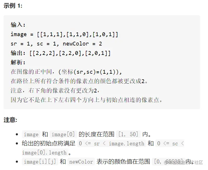 给你一个坐标 (sr, sc) 表示图像渲染开始的像素值(行 ,列)和一个新的颜色值 newColor,让你重新上色这幅图像。