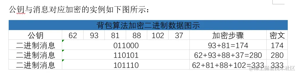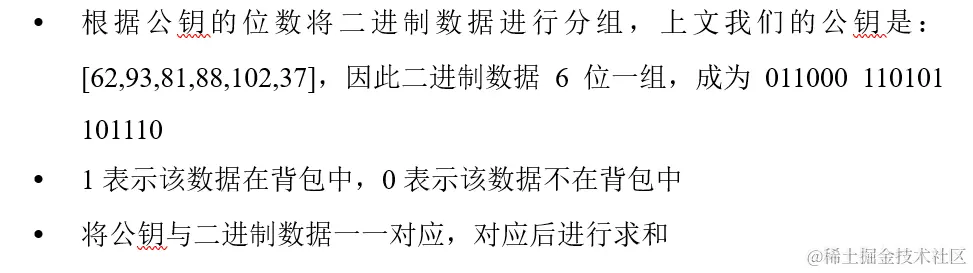 通过以私钥为基础构造公钥,此时当我们拿到公钥的时候,我们开始使用公钥进行加密数据,假如我们拿到一个二进制的数据011000110101101110,背包加密算法对该二进制数据加密的主要流程是:
