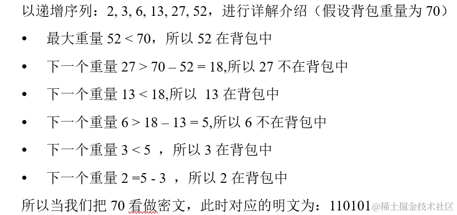 在背包问题当中,若物品的重量列表是一个超递增序列,这个问题是很容易的出答案的,解决超递增序列的背包问题主要有以下几个步骤:假如有一个背包,背包的重量已知,将这个背包的重量与我们已知的超递增序列中的最大值进行比较,如果背包的重量小于这个数,那么这个数不在背包中,如果重量大于或等于这个数,那么这个数在背包中,用背包的重量减去这个数,得出的结果继续与序列中的下一个数进行比较,重复比较直到比较完为止。如果背包的总重量减到0则该背包问题得出解,反之则无解。