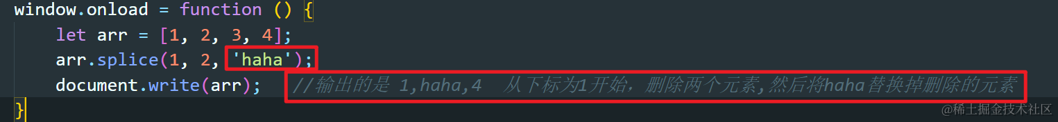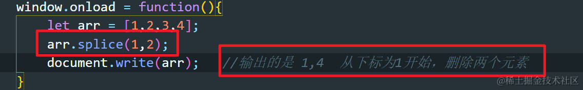 javascript中的splice方法 Always_positive 2021-04-08 114 阅读1分钟 当传入一个参数 let arr = [1,2,3,4]; arr.splice(1); document.write(arr); //输出的是 1 说明删除下标为1和后面的所有元素 当传入两个参数 当传入三个参数 原数组会改变吗? 会改变!!!